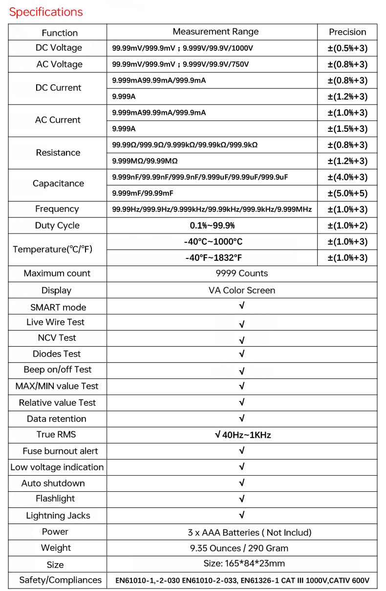 Ensure Safety: (1) The multimeter is certified with CE and RoHS. (2) The design and manufacture of the instrument strictly comply with IEC61010-1 CAT III 1000V, CAT IV 600V overvoltage safety standards, and pollution level two. (3) The silicone cover can protect the multimeter from wear and electric shock. (4) The dual ceramic fuses, which have anti-burn and overload protection functions, can effectively protect the multimeter.